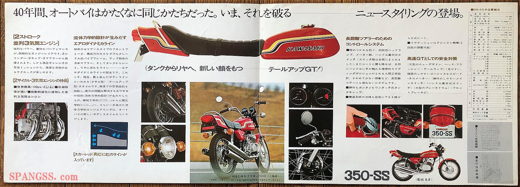 2ストローク並列3気筒エンジンは、「モーターサイクル史上初のレイアウト」という紹介で、独自技術を高らかに謳っています。現金正価(工場渡し)¥298,000 は、ホンダの「CB750FOUR」に比べると、¥87,700も低い価格でした。